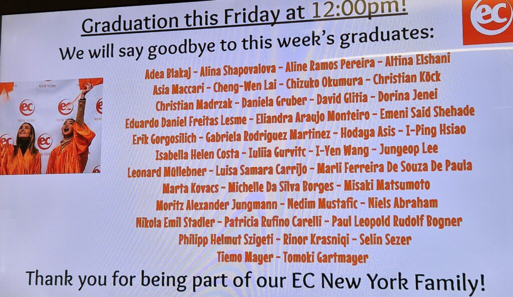 Der 10. Oktober war der Graduation Day der Sprachschule und ein Grund zum Stolz: Die Schüler*innen der 5BHBT wurden für ihre hervorragenden Englischkenntnisse gelobt, Christian Köck erhielt sogar die Auszeichnung „Student of the Week“. Anschließend nutzten alle die Freizeit individuell: Einige besuchten das Naturhistorische Museum, andere fuhren nach Coney Island oder gingen shoppen.